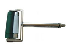rodillo de goma que se emplea para adherir de manera correcta cintas y etiquetas adhesivas sobre una placa metálica de acero bruñido para realizar ensayos de resistencia de adhesividad en un dinamómetro. la función principal del rodillo de goma es evitar que la cinta adhesiva quede con burbujas o pliegues al momento de adherir la cinta.